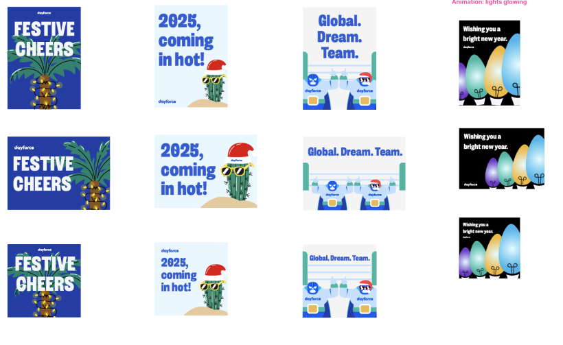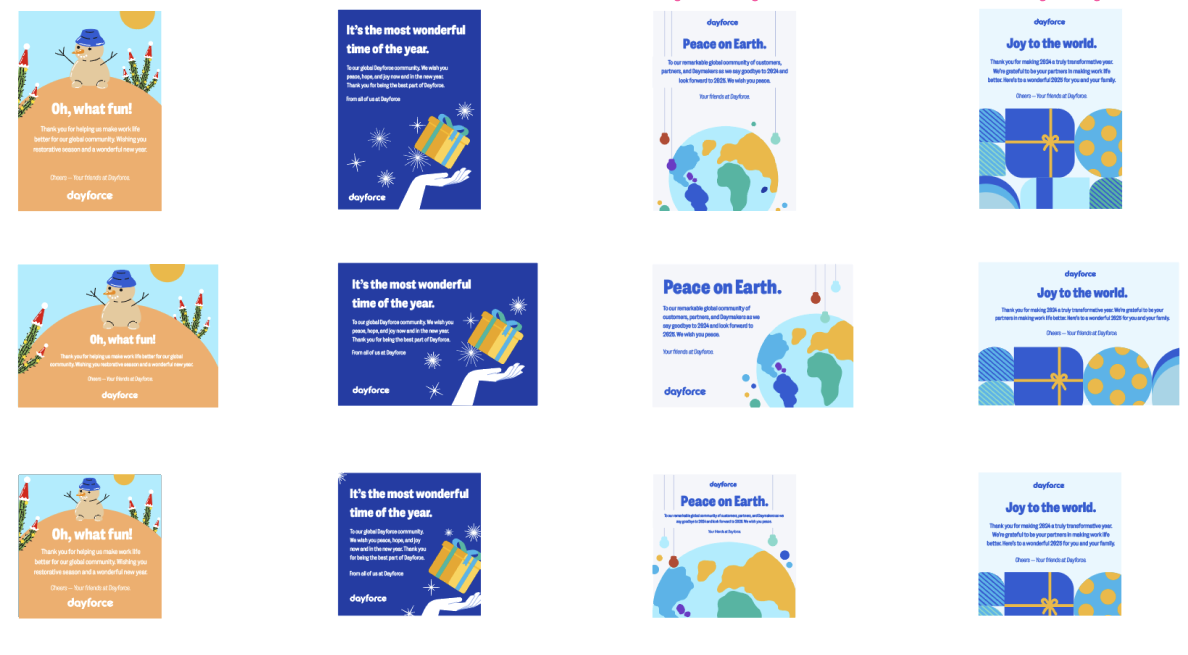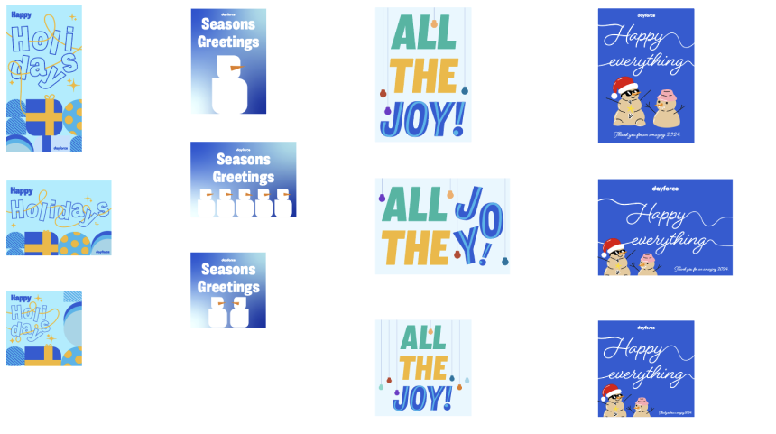 My time at Dayforce has been nothing short of exciting. I’ve had the opportunity to work on a wide range of branding and signage projects for major events, including trade shows, launch parties, and our flagship yearly event, Dayforce Discover (formerly known as INSIGHTS). This event, which attracts thousands of attendees—ranging from staff to customers—serves as a key platform for us to announce major company milestones. Last year, we used the event to unveil our 2024 rebrand to 'Dayforce.' Contributing to such a significant rebrand in under a year was a tremendous challenge, involving everything from new logo ideation and developing brand guidelines to updating resources and envisioning the future of the Dayforce brand. The entire design team learned a great deal throughout this process.